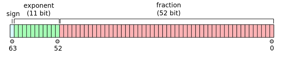 IEEE 754 标准规定,binary64 的格式是:64 位 = 1 位符号 + 11 位指数 + 52 位有效数字。