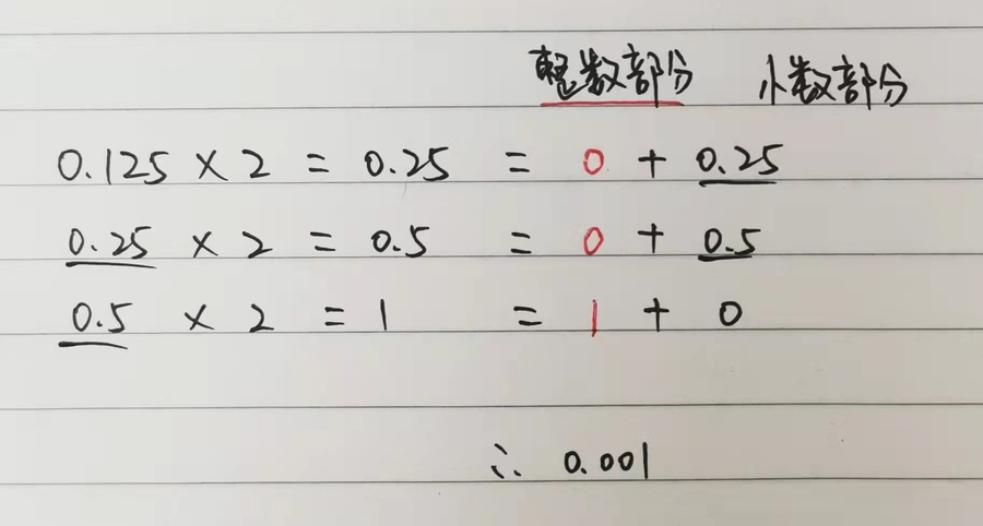 - 小数部分:乘 2 取整数(正着取),直到小数部分为 0