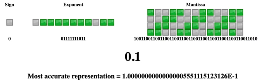 继续以十进制的 0.1 为例,我们知道了它在内存中存储的真实数值并不是 0.1 而是 0.100000000000000005551115123126,其 IEEE 754 binary64 的内存存储如下: