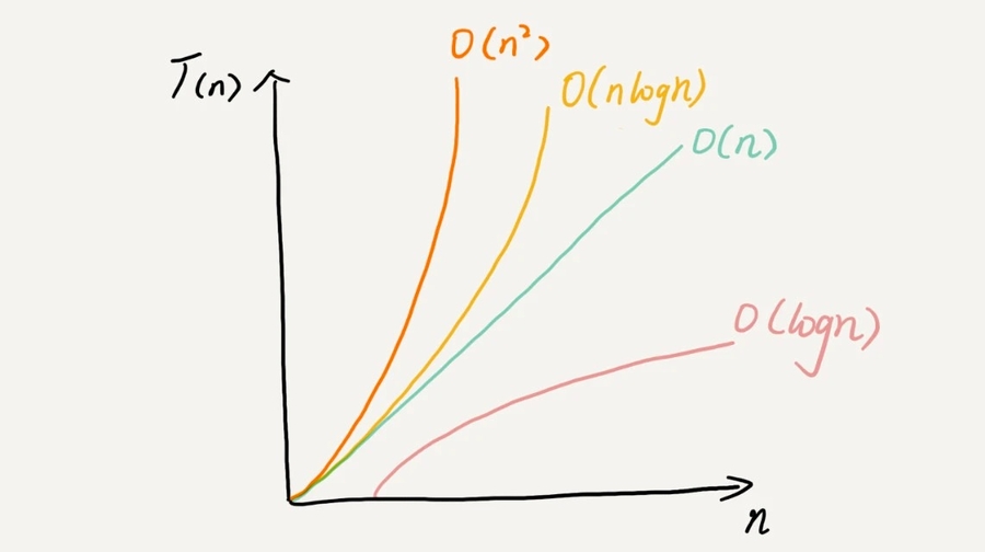 T(n) = O(f(n)),其中,n 表示数据规模的大小, T(n) 表示所有代码的执行时间,f(n) 表示每行代码的执行次数之和。大 O 表示 T(n) 和 f(n) 成正比,即代码的执行时间和代码的执行次数成正比。